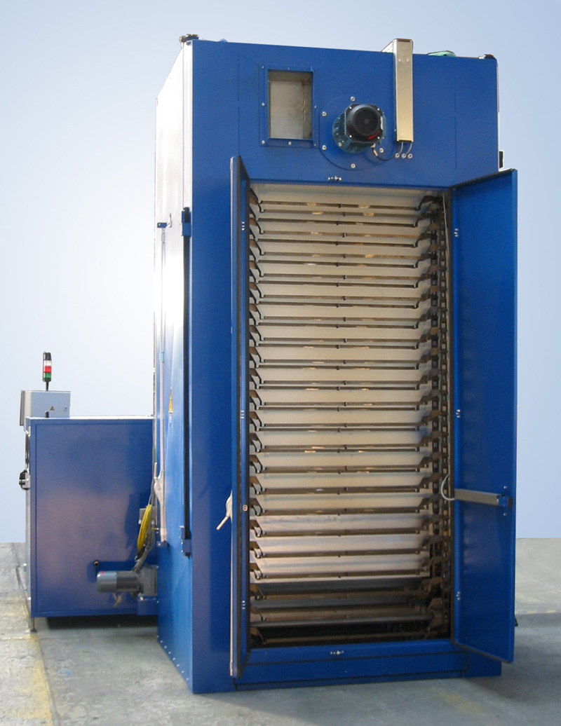 Die Warenträger takten durch die Anlage, durchlaufen automatisch das Tauchbecken, die direkt gasbeheizte Trockenzone und anschließend eine Kühlstrecke.